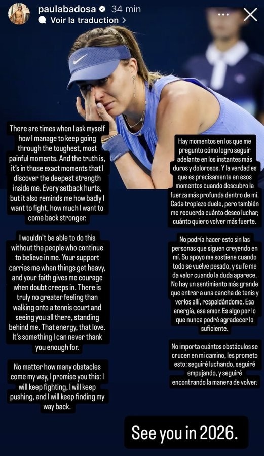 西班牙網球明星巴多薩在近期的中網女單第三輪比賽中因傷退賽後,透過社交媒體向粉絲們宣布,她將提前結束2025年的賽季。巴多薩在發文中表達了自己內心深處的感受,回顧自己在困難時刻的堅持與努力。