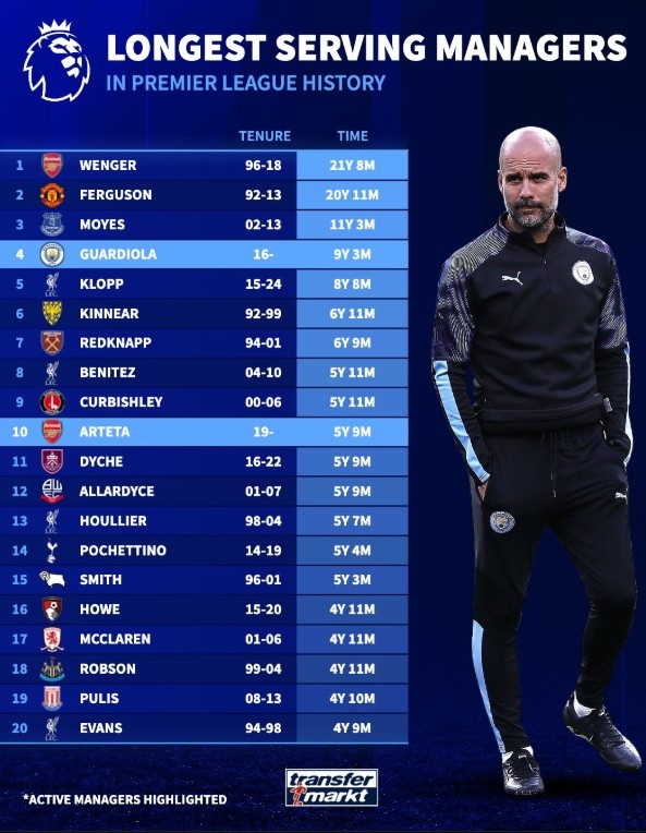 英超历史主帅任职时长排名 温格和弗格森位列前两名 瓜迪奥拉排名第四