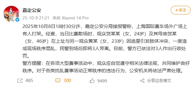 10月10日,上海嘉定公安分局發布公告,通報了一起發生在上海國際賽車場外的肢體衝突事件。該事件發生在10月8日,原因為觀眾追星而引發衝突。警方對三名涉事人員進行了行政處罰。